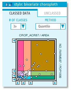 This is a 3-class x 3-class bivariate choropleth map from indiemapper that uses a diverging x diverging scheme (more here about color schemes. Below that is a scatterplot which allows you to see the numerical distribution of your observations and make informed decisions about how to best classify your data (more here about data classification. Just like a histogram for single-variable maps, a scatterplot is a useful tool for devising classification schemes for bivariate choropleth maps.