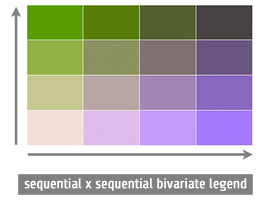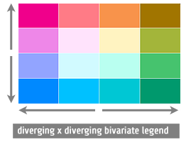 There are two kinds of bivariate choropleth color schemes: diverging x diverging, and sequential x sequential. Both should be used with either numerical data or with rankable categorical data. With sequential, colors simply go from light to dark across the color ramp; it is cartographic convention that “darker = more” so that the larger numbers attach to the darker colors, although if your map is going to be displayed against a dark background, that rule is inverted (it is the “high contrast” colors, against the background, that are the most easily seen and stand-out).