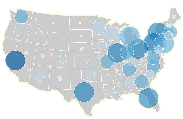 Bivariate proportional / graduated symbol maps combine two datasets (usually numerical data) into a single hybrid map symbol. They are very efficient because the size of the symbol tells you one thing and the color/fill tells you another. These maps exemplify the power of bivariate maps by allowing us to easily examine geographic relationship between two variables (like income and education). They inherit many of the strengths and weaknesses or univariate proportional symbol maps, outlined here. Like single-variable graduated symbol maps (in which the size and color of the symbol show the same data), an important decision here is whether or not to group your data into classes or to show unfiltered “raw” data (assuming your data aren’t already classed for you, in which case, the decision is moot).