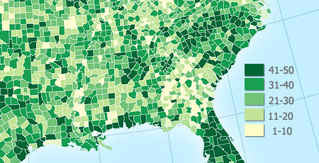 This map uses a 5-class equal interval classification scheme (1-10, 11-20, …).
