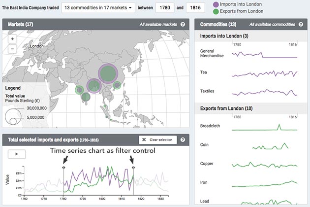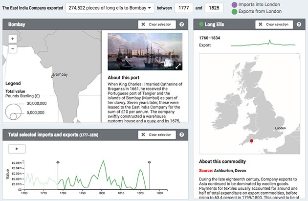 The map and data displays have been filtered by commodity (long ells), geography (Bombay), and a time range. The title area explicitly states all this.