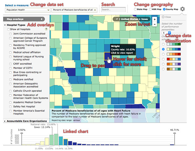 Additionally, sophisticated data- or story-driven maps often fold automatic panning and zooming into interactions with the data or story, a helpful way to guide users through something potentially very complex. For example, clicking on the state choropleth map below zooms to a state and reveals data in finer geographic detail.