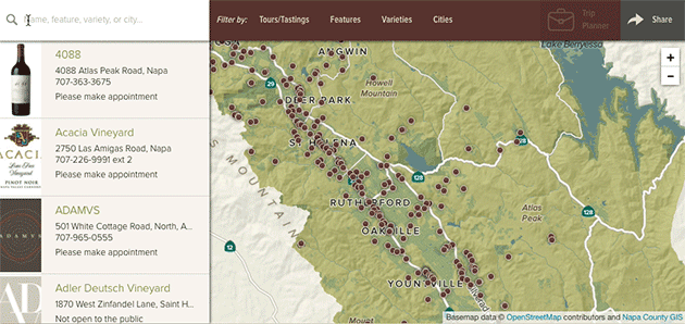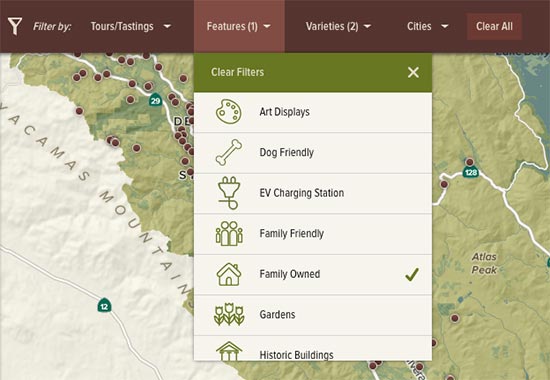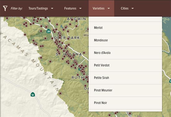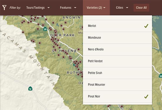 Filtering, quite often, accomplishes the exact same thing as a search, just approached from a different direction. Take that wineries map above, for example: the same results for that “pinot” search could have been achieved by clicking some filters in the “Varieties” menu. Filtering is more than just an alternative method for searching, though. It does a few things that are advantageous: