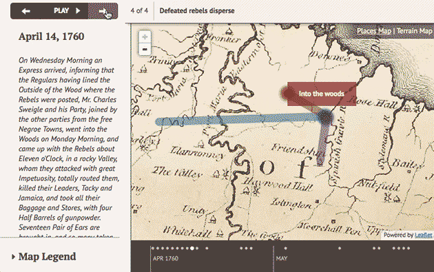 Or, in a map with a narrative story such as below, advancing through the story (via arrow buttons at the top left, among other methods) moves the map to different points of interest.