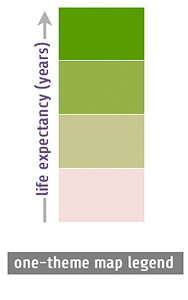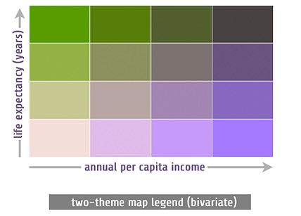 The majority of thematic maps show one attribute such as per capita income. Often a simple univariate maps is all you need since you only have one attribute to map (that was easy!). However, sometimes the most interesting and informative thematic maps deliberately juxtapose two or more thematic datsets. This makes it possible for readers to compare different data sets directly and, often, helps us to see important connections. For example, a bivariate map of per capita income and life expectancy might reveal a strong correlation between those variables. Multivariate maps also help us to save space, since we can put more data on a single map rather than spread them across a series of single-theme maps. When they work well, the best multivariate maps are greater than the sum of their parts and tell rich, complex spatial stories.