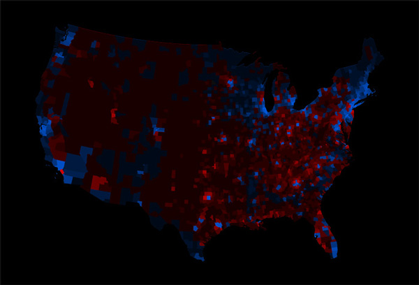 This map shows the results of the 2008 Presidential Election in the United States. Like many election maps, blue represents votes for Obama and red votes for McCain. The more saturated either color, the greater their margin of victory was for that location. So far, this is just a normal choropleth election map, but the second variable on this map is total population. The greater the number of people in a location, the less the mask obscures the underlying election data. Areas that are very sparsely populated, like rural Montana, are largely blocked by the alpha mask (despite being geographically quite large). On the other hand, Chicago may be geographical small, but its large population means that the alpha mask lets it show through so that it stands out more on the map and looks, relatively speaking, more important. And in an election it is, in fact, more important: More votes are at stake in highly populated centers, which stand out on the map.