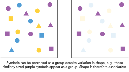 An associative variable allows grouping across changes in the variable; in other words, a variable is associative if we can perceive symbols as a group despite differences in this variable. Note that this does not mean the variable is not selective. For example, hue is both: we can easily select symbols of the same color, but a group of differently colored symbols is itself also perceptible as a group.