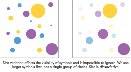 Of Bertin’s variables, value (lightness) and size are dissociative. Both affect the visiblity of symbols (bigger symbols are more “visible” for example), and thus it is not possible to perceive a group despite variations in these.