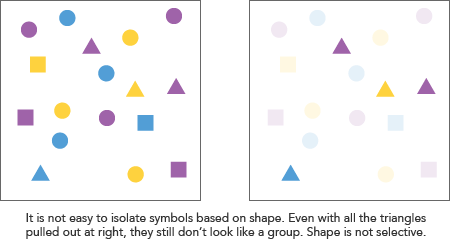 What does this mean for maps? A quick rule of thumb here is to avoid visual variables that are not selective (i.e., shape) if you want to highlight patterns. For example, on a reference map you might use symbols with different shapes to represent banks, hospitals, and schools. However, if these institutions are related to the theme of a map and you want readers to quickly identify the spatial patterns of them, use a different variable such as color to distinguish them from one another.