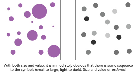 Ordered variables have an immediately recognizable sequence. In other words, if you can order the symbols by their difference in a variable without having to consult a legend, the variable is ordered. Size and value, for example, have an immediately perceptible order. Position does too: symbols can naturally be seen as ordered from left to right or vice versa, for example. Color hue is an example of a non-ordered variable: there is no clear ordering of, say, red, green, and blue.