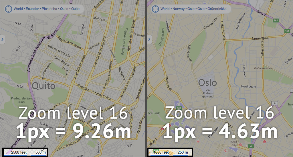 - As implied above, scale is not constant around the world. Be suspicious if someone presents you with Google Maps screenshots of two different places “at the same scale.” Zoom level is not the same as scale. At high latitudes, where areas are enlarged, a tile represents less area than near the equator.