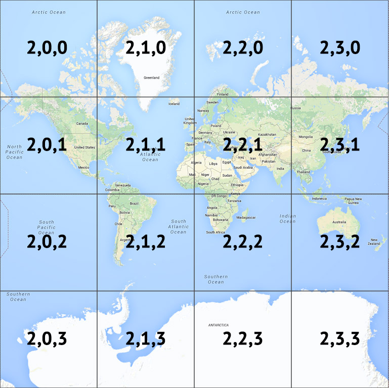 Tiles are typically numbered with [z, x, y] coordinates. This example is zoom level 2.