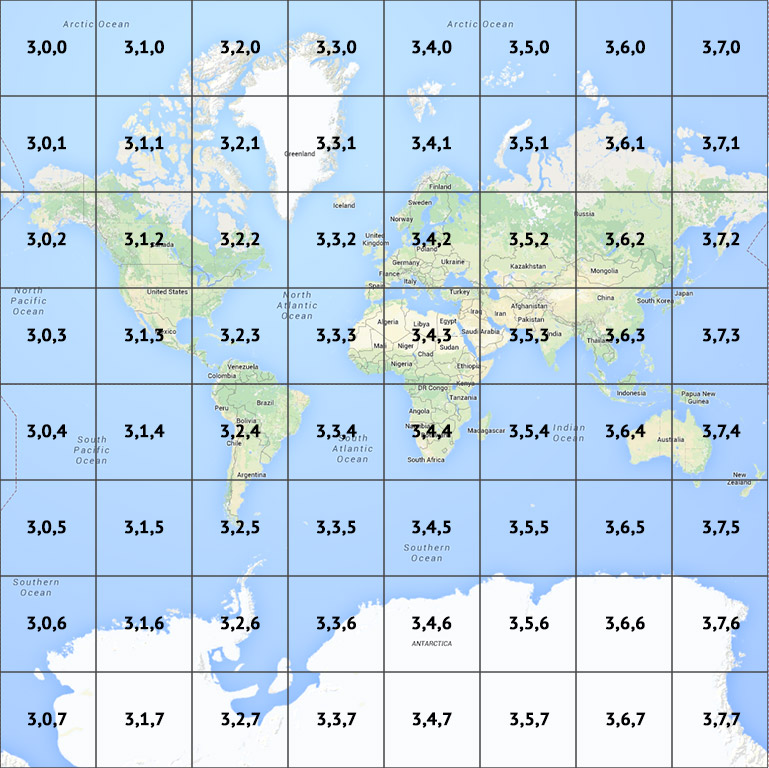 Tiled maps use a standard tiling scheme which is worth understanding. Tiles are idenfied by three numbers, typically in this order: